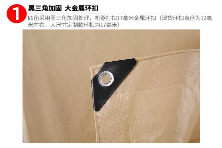 產品介紹肉色PE防水篷布加厚包角,四角采用黑三角加固處理,大金屬環扣,機器打扣17mm金屬環扣。肉色PE防水篷布四邊打孔,默認常規1米一個···